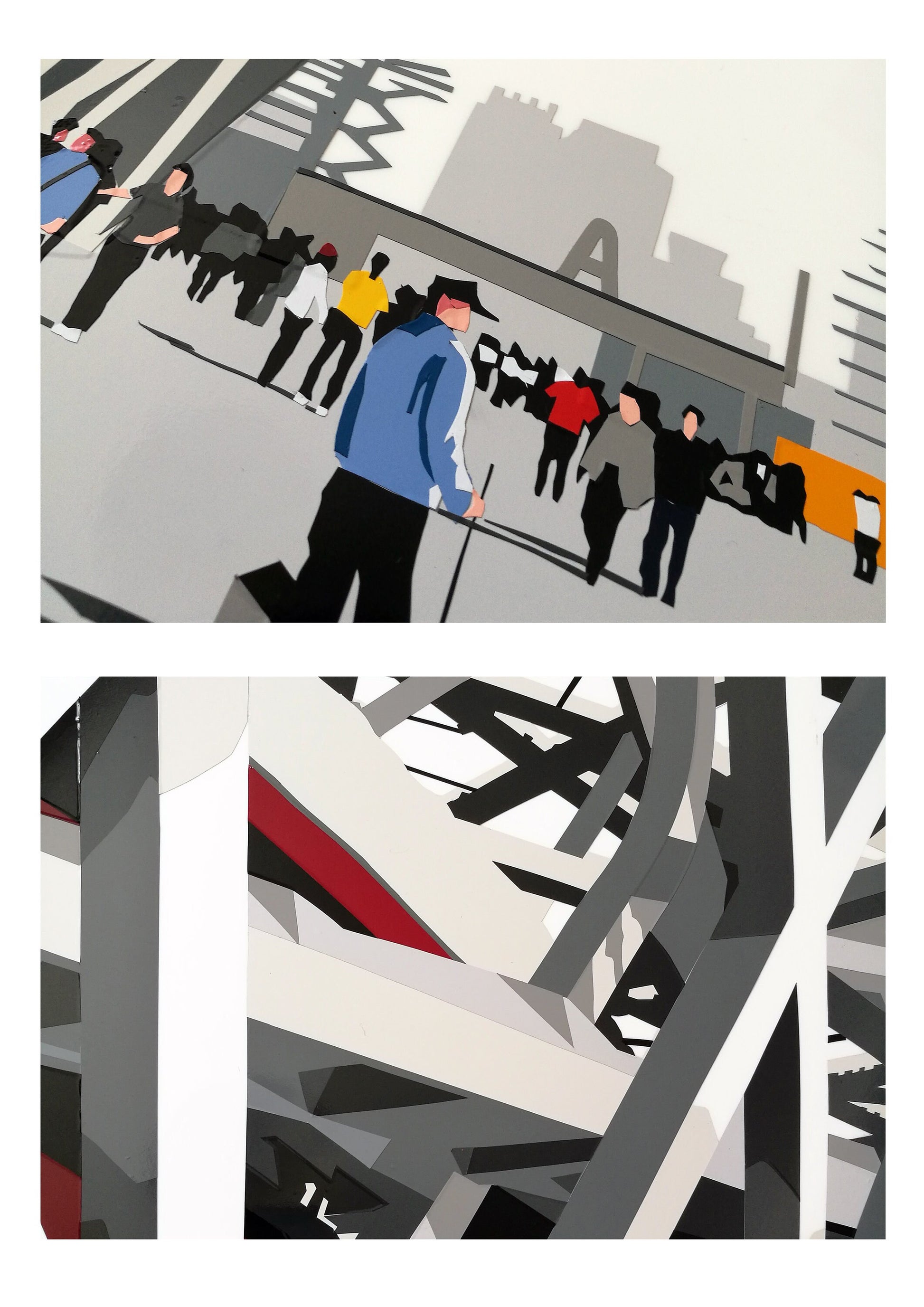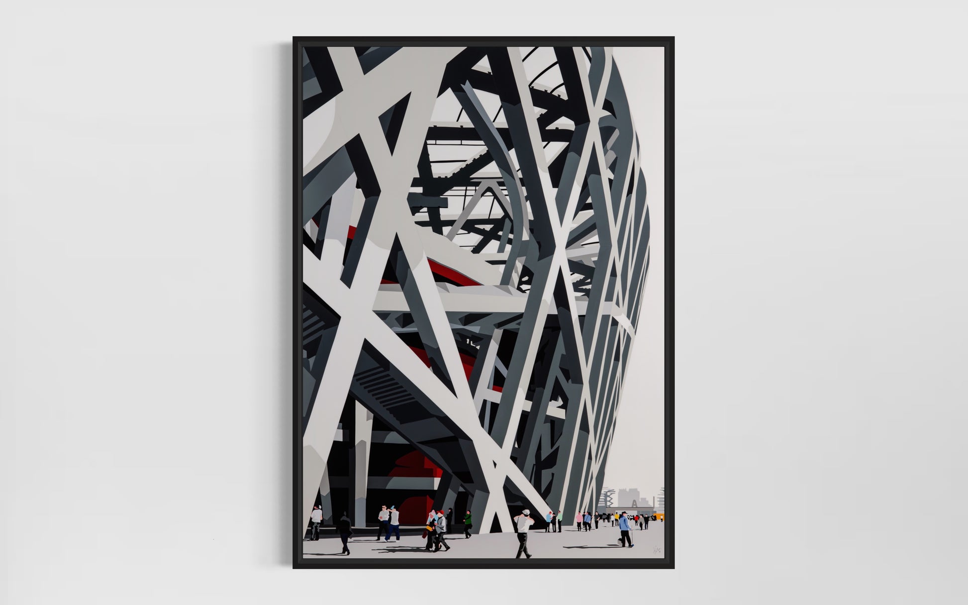 Fine art print on 240gsm bright white matte paper. Signed and limited to 100 editions of each size. Taken from the hand-cut vinyl original artwork, that depicts visitors viewing the stunning architecture of the Bird's Nest stadium in Beijing, China.