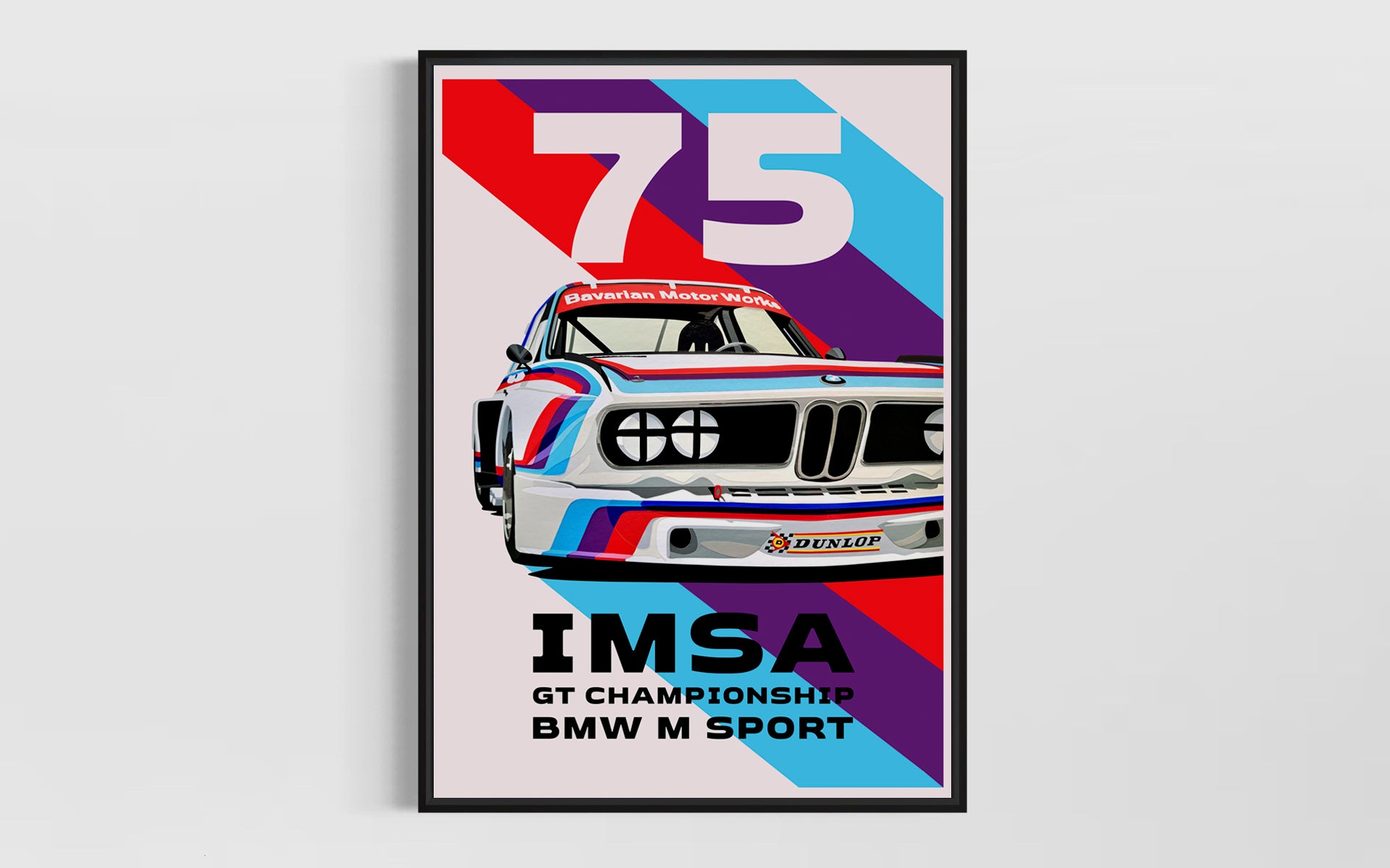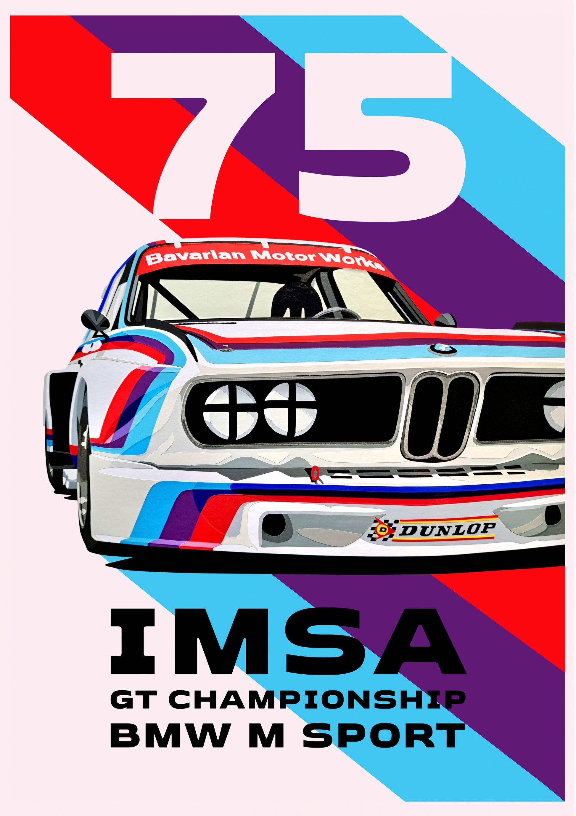 This design features the 1975 BMW 3.0 CSL 'Batmobile', and was the first car to race in the now iconic M-Sport colours. The artwork pays homage to the graphic design of the mid 70's, and celebrates the awesome IMSA GT series.