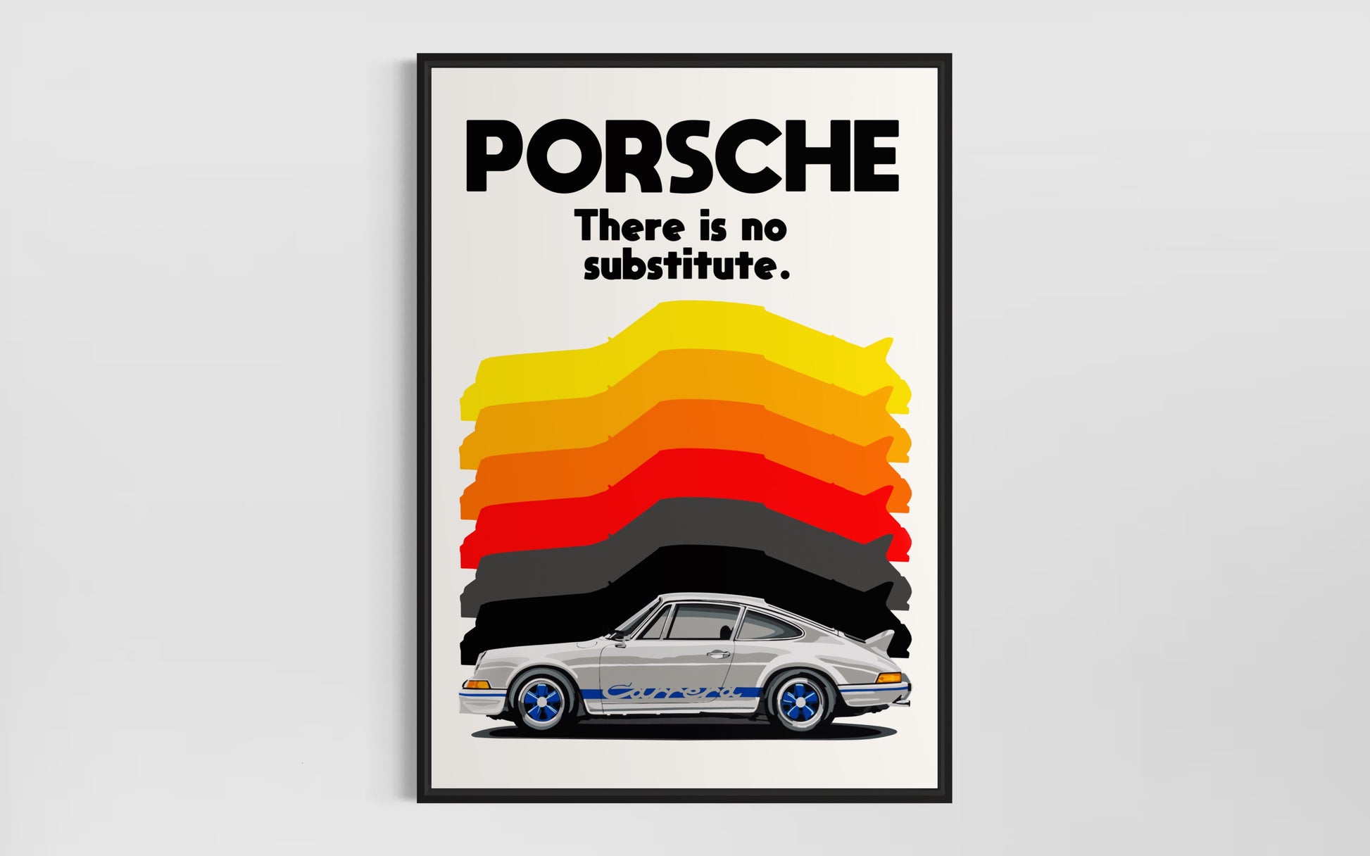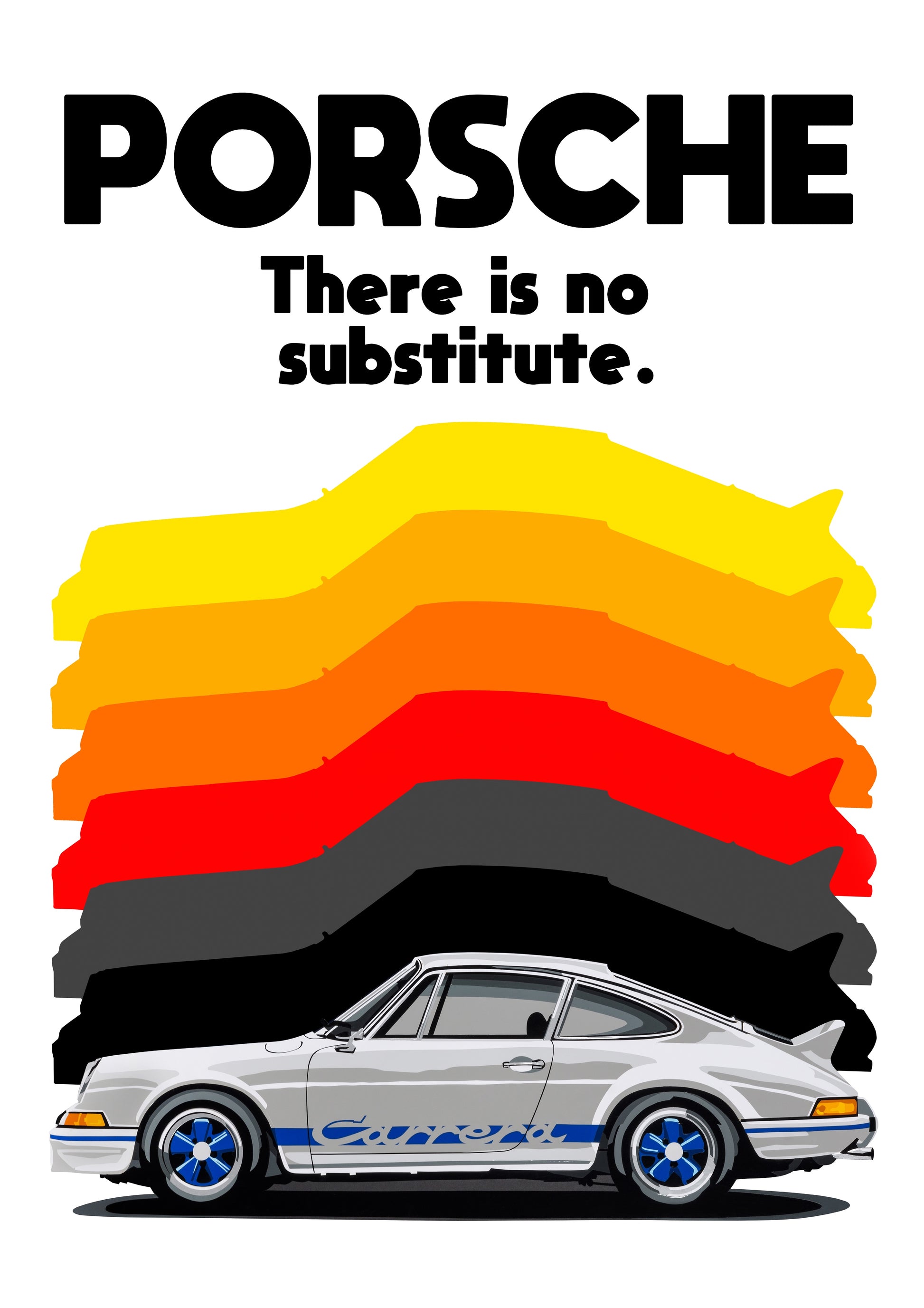 This design features a 1972 Porsche 2.7 RS, and is designed in homage to the Porsche print advertising of the 1970's.