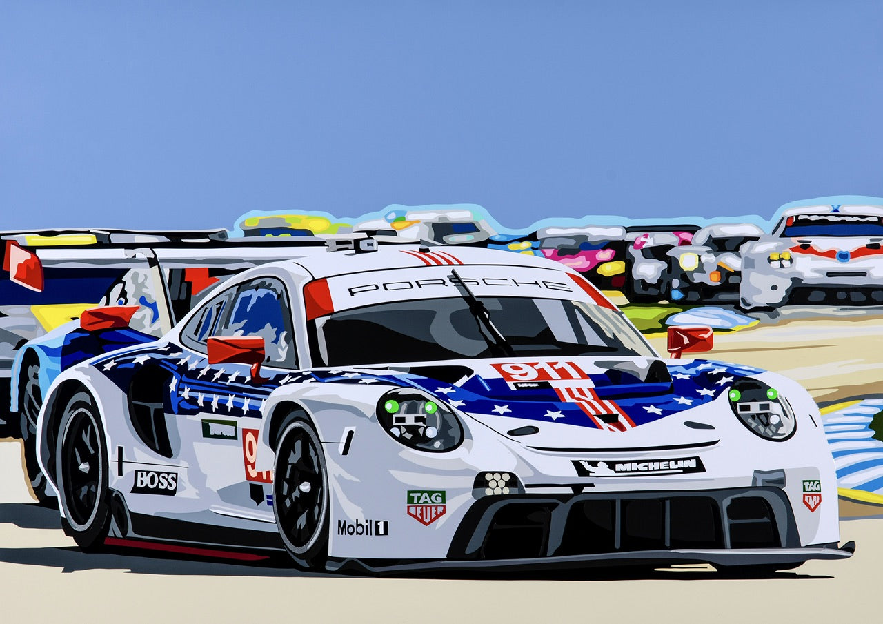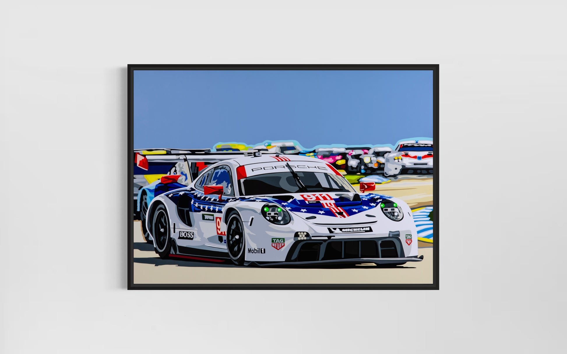This print depicts the Sebring 911 RSR in the one-off US celebratory colours. The original artwork was commissioned in celebration of the win at Sebring, during the 70th anniversary year of Porsche.