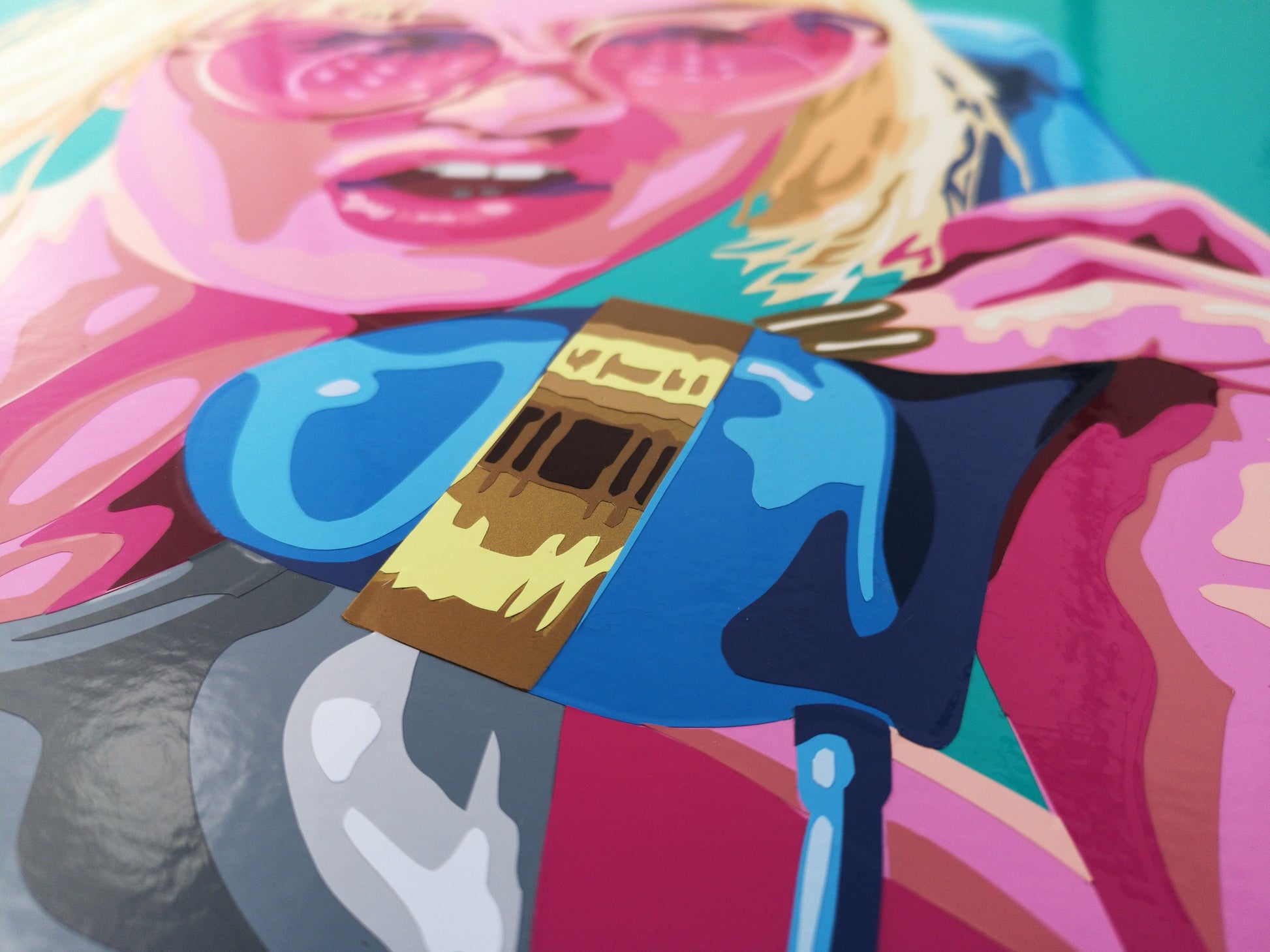 Fine art print on 240gsm bright white matte paper. Signed and limited to 100 editions of each size. Taken from the hand-cut vinyl original artwork, this was No.2 in the 80’s aesthetics series. This piece looked into the popular imagery of consumerism of the era, but now with empowerment being shifted in to the hands of the woman.