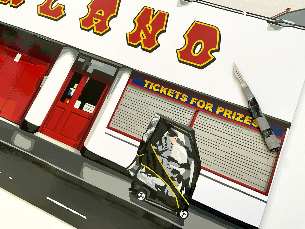 A original artwork from my collection of British seaside-themed artworks, featuring the often ignored views found in every coastal town. This scene depicts a reimagined depiction of an amusement arcade in Portrush, Northern Ireland. Even though it’s an all-to-common grey sky, there are still bold bursts of colour to brighten the dampest of scenes.