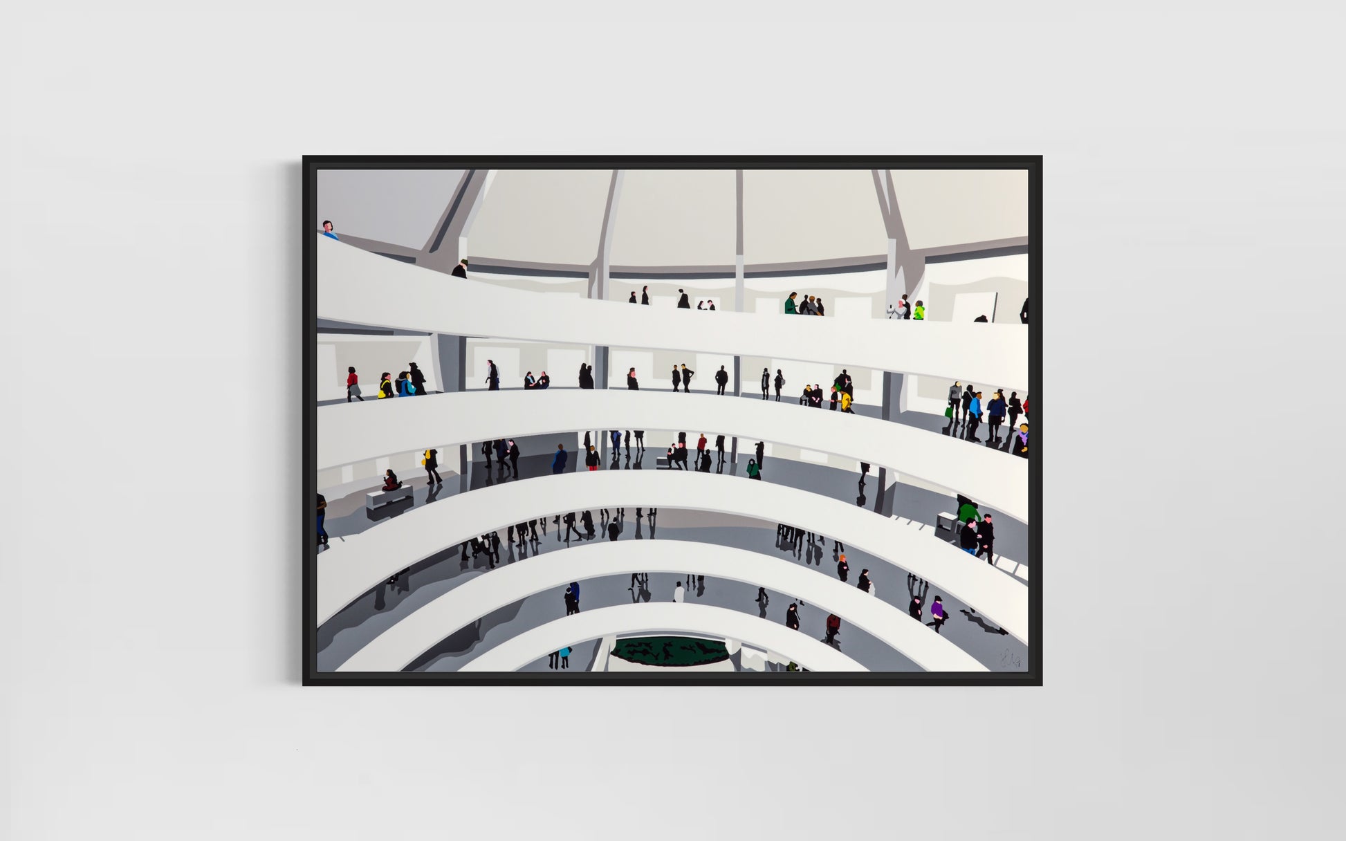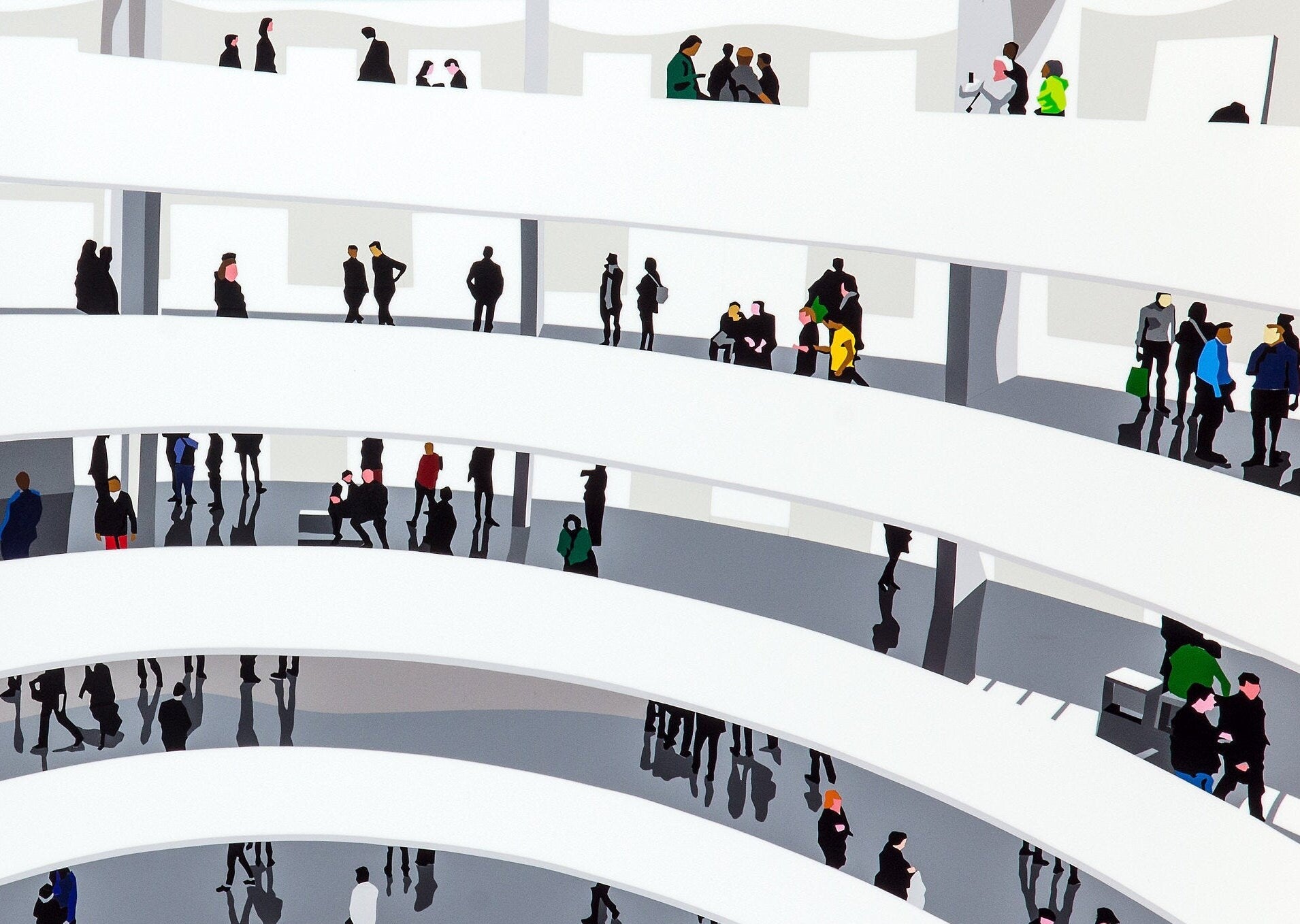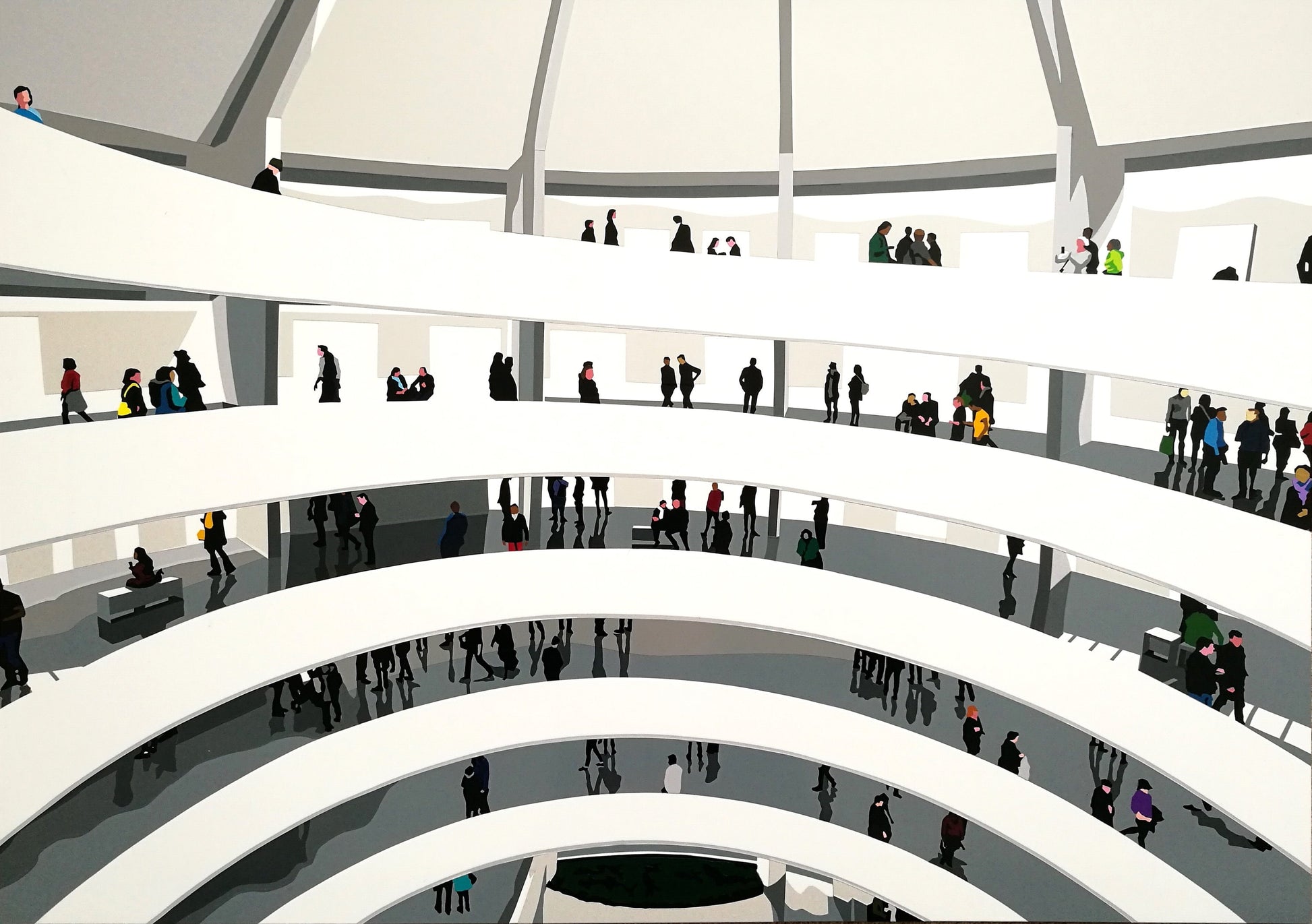 Fine art print on 240gsm bright white matte paper. Signed and limited to 100 editions of each size. Taken from the hand-cut vinyl original artwork, that depicts visitors viewing the exhibitions around the famous Guggenheim Museum in New York.