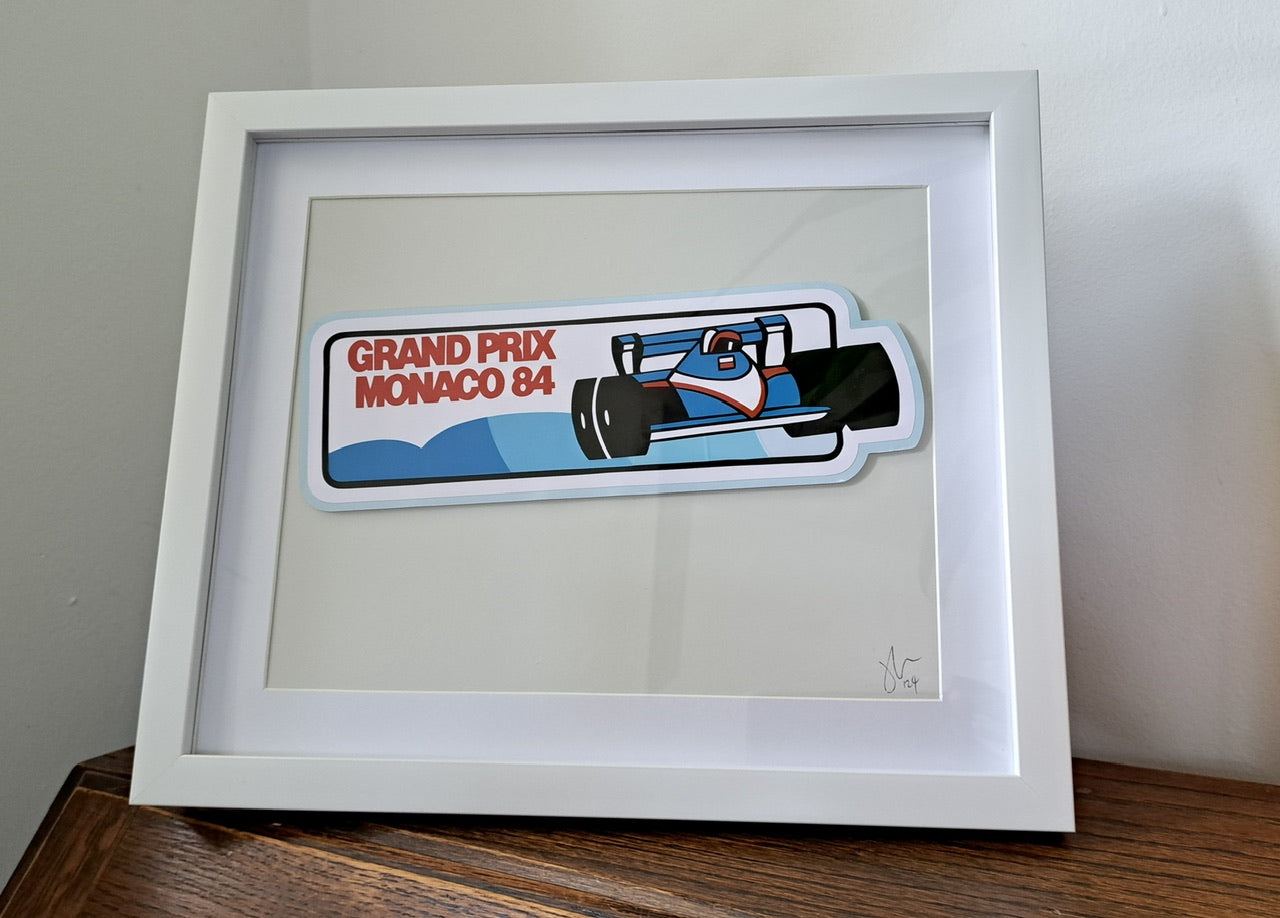 This rendition of the Monaco GP sticker is made from individually hand-cut coloured vinyl shapes - without even using a ruler - to make a fine art version of this classic retro sticker that was used to promote this iconic race.
