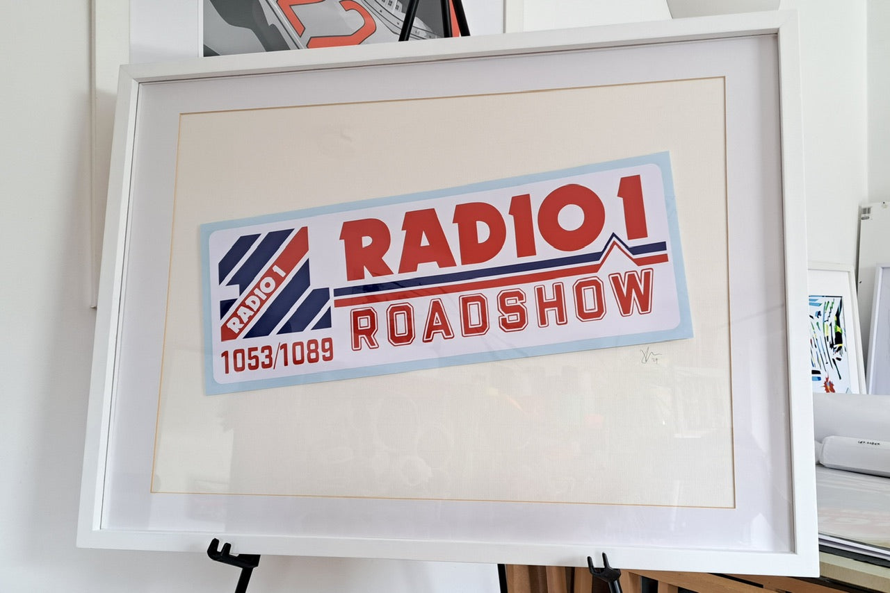 This rendition of the iconic 1980’s Radio 1 Roadshow sticker is made from individually hand-cut coloured vinyl shapes and letters - without ever using a ruler - to make a fine art version of this once sought sticker.
