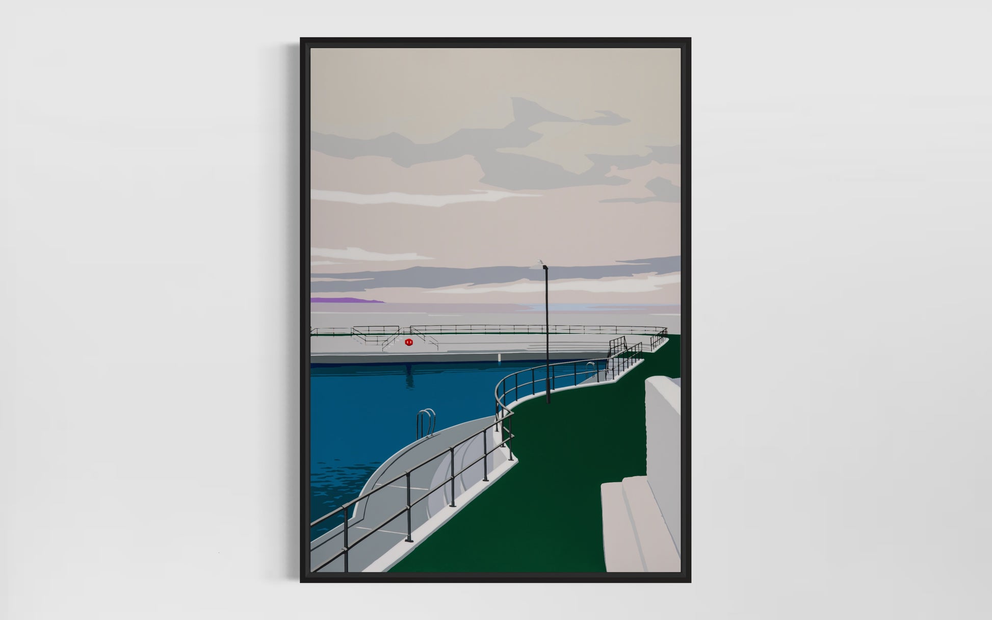 Fine art print on 240gsm bright white matte paper. Signed and limited to 100 editions of each size. Taken from the hand-cut vinyl original artwork, as part of the British Seaside series. This scene depicts the view out to sea from within the Jubilee Pool complex, Cornwall. As part of the 'backend of the British seaside' collection, I wanted to show that even on the dullest of days, there are still generous 'dollops of colour' to be found.