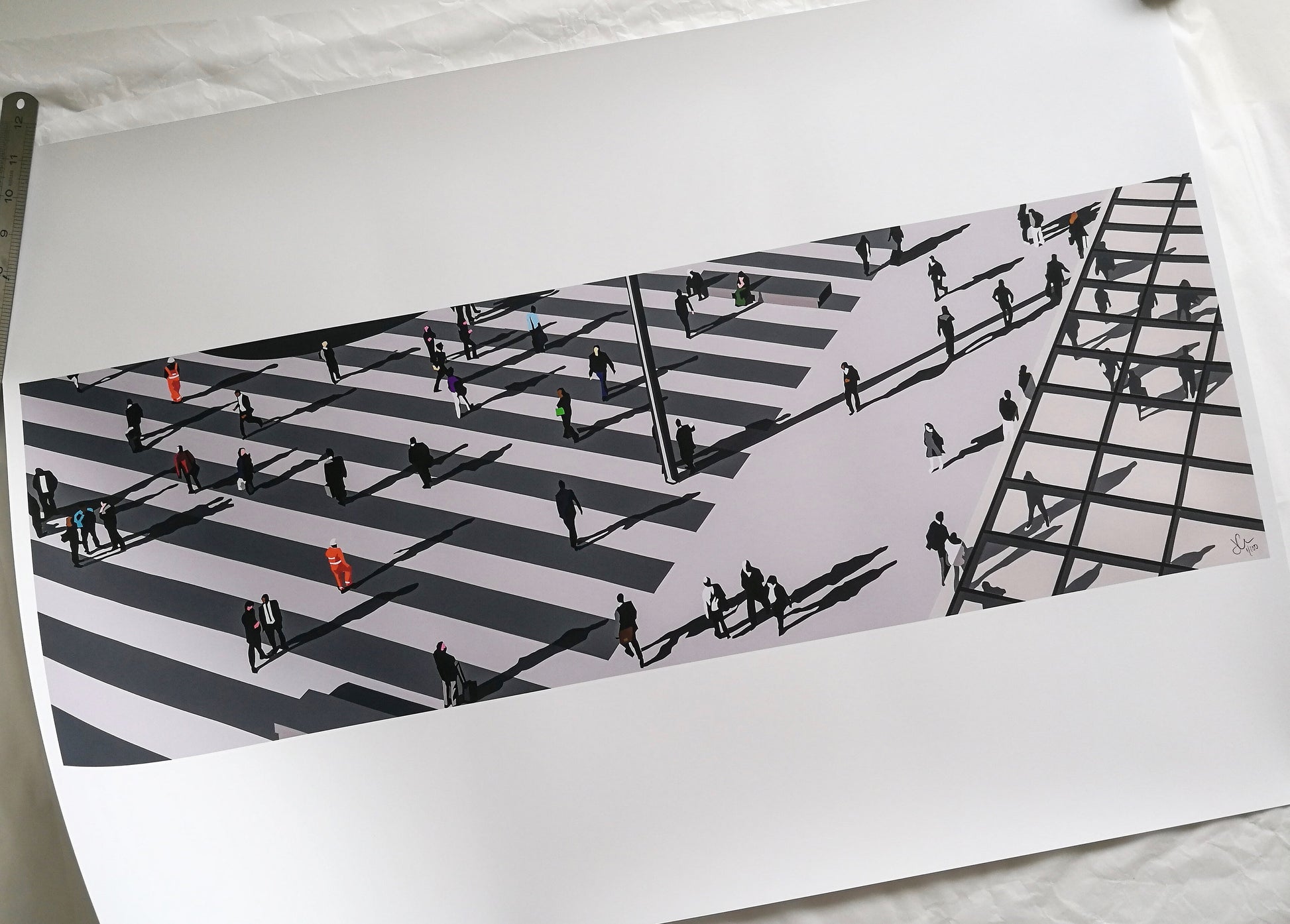 Fine art print on 240gsm bright white matte paper. Signed and limited to 100 editions of each size. Taken from the hand-cut vinyl original artwork, that depicts commuters walking outside of the front of King's Cross station, London.