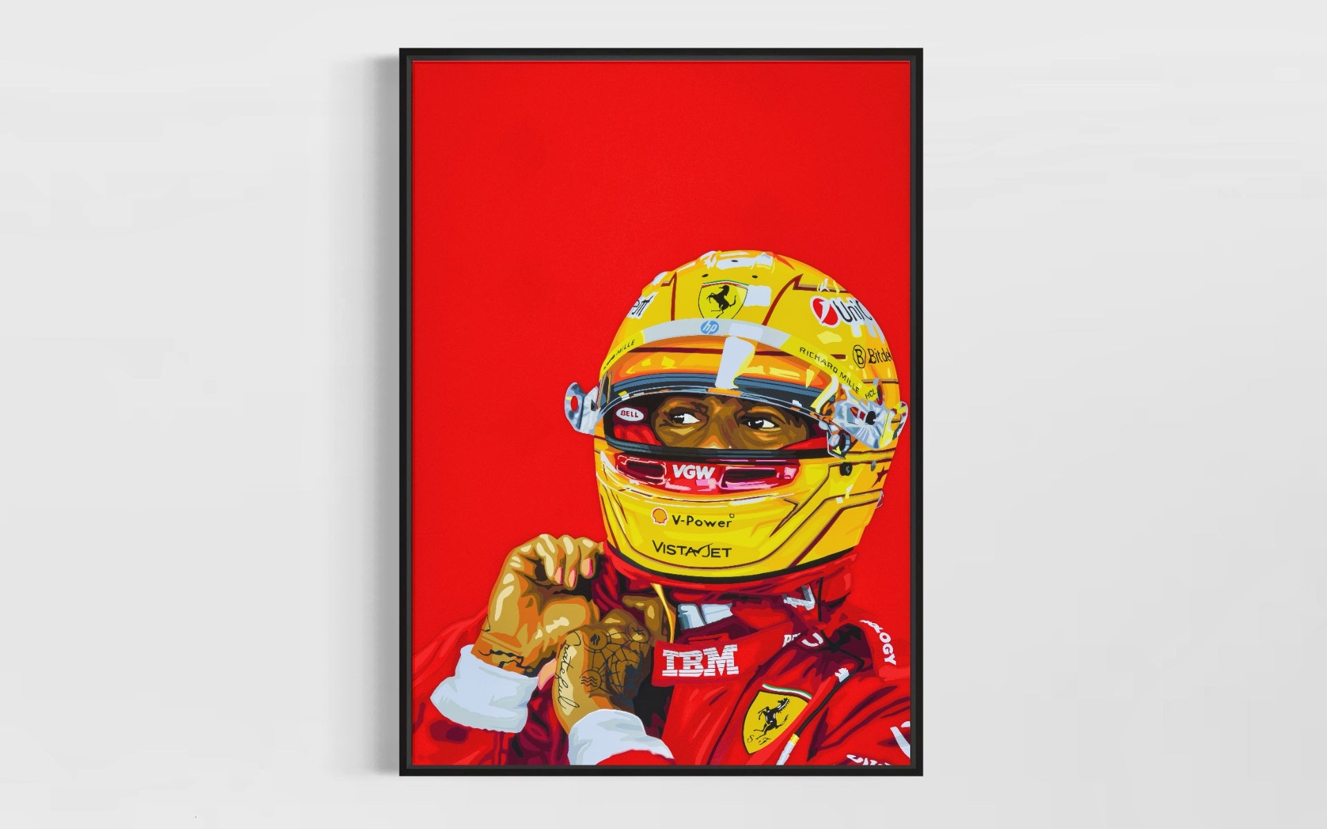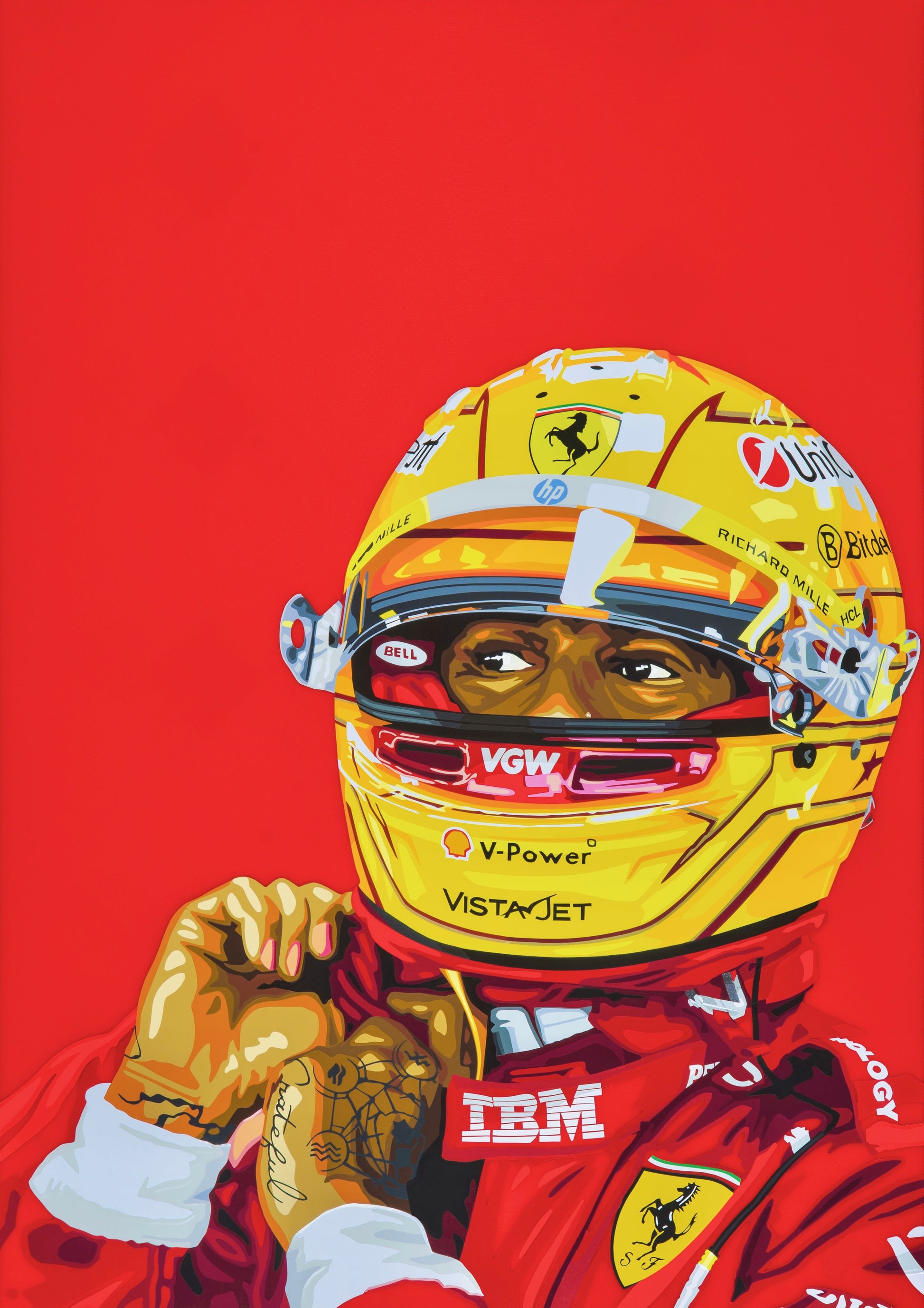Created to mark the beginning of Lewis’ historic move to Scuderia Ferrari, this piece depicts seeing Lewis for the first time in full race colours as he prepares for his first test-run at Maranello in January 2025. (Watermark is not part of final image)