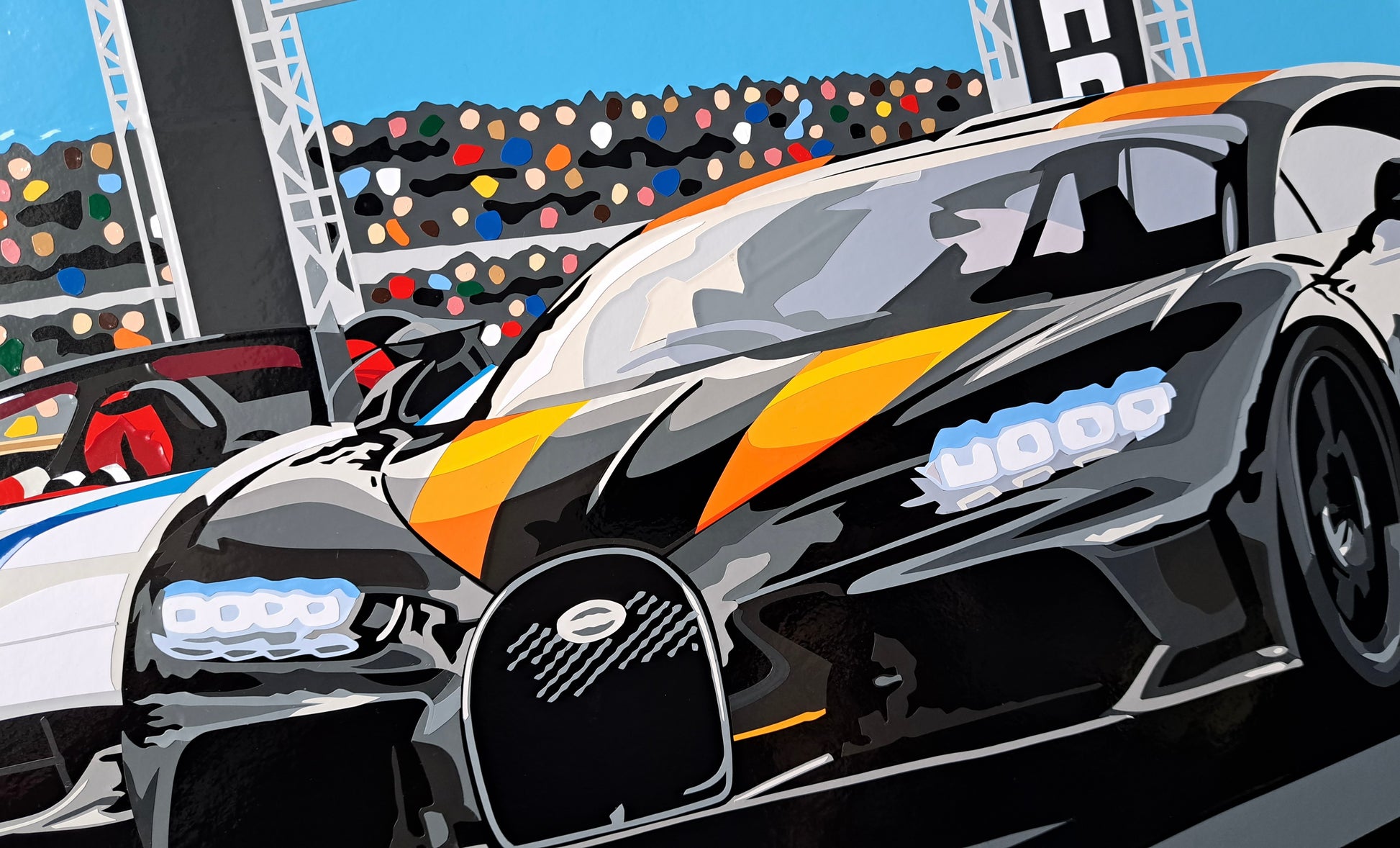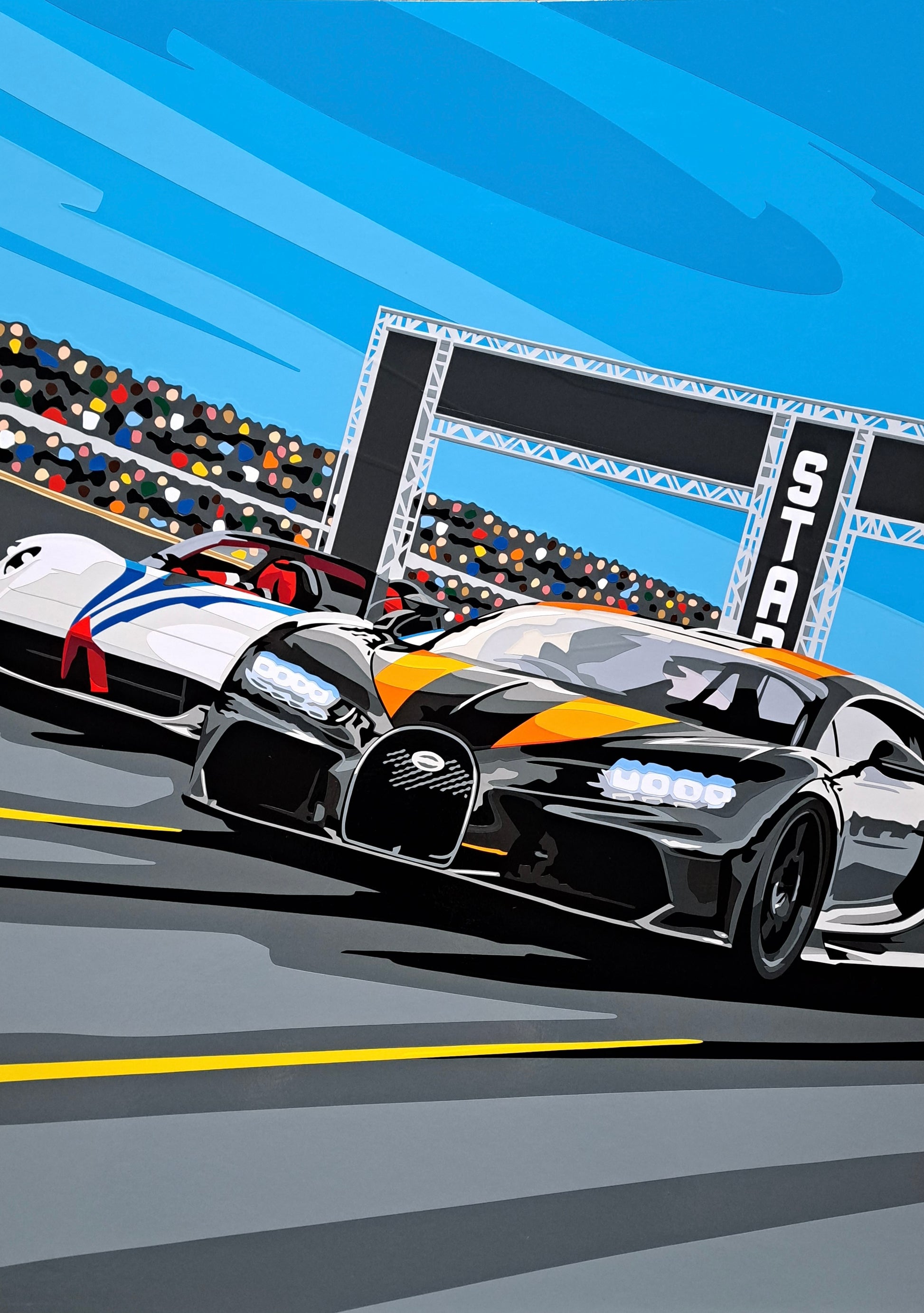 This is an original hand-cut vinyl artwork on A2 size artboard. It’s the artwork for the official 2023 Supercar Fest poster design, featuring the Bugatti Supersport 300+ vs the Pagani Huayra on the runway at Sywell Aerodrome.
