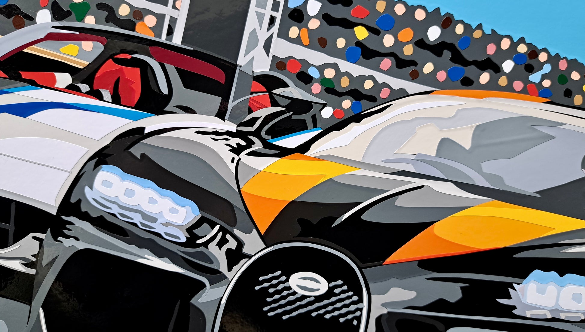 Created by hand-cutting 100’s & 100’s of coloured vinyl shapes to then apply in the form of a jigsaw/collage to make a truly unique artwork with the same ‘finish’ as that of the car being depicted.