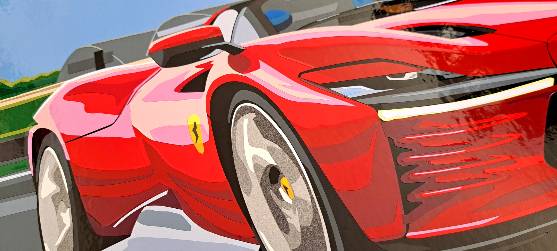 Created by hand-cutting 100’s & 100’s of coloured vinyl shapes to then apply in the form of a jigsaw/collage to make a truly unique artwork with the same ‘finish’ as that of the car being depicted.