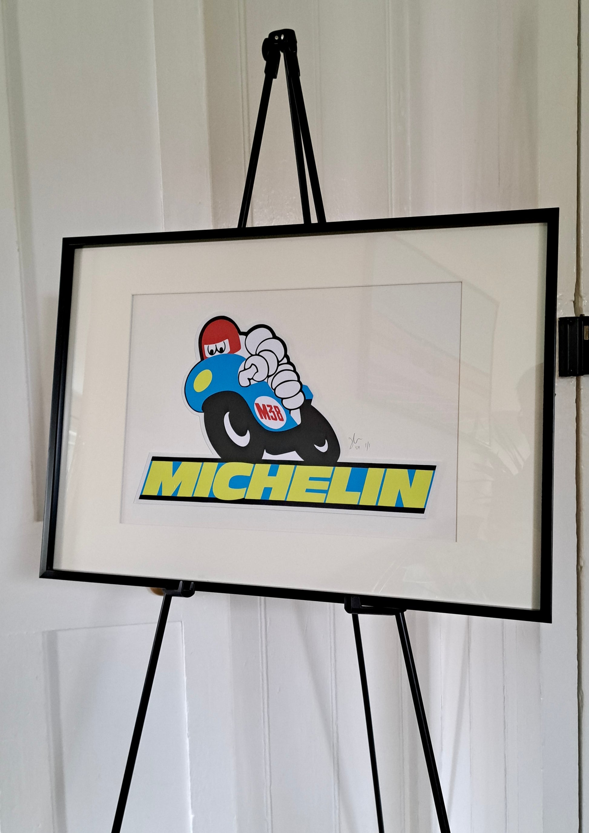 This rendition of the Michelin Motorcycle Tyres sticker is made from individually hand-cut coloured vinyl shapes and letters - without ever using a ruler - to make a fine art version of this once sought after sticker.