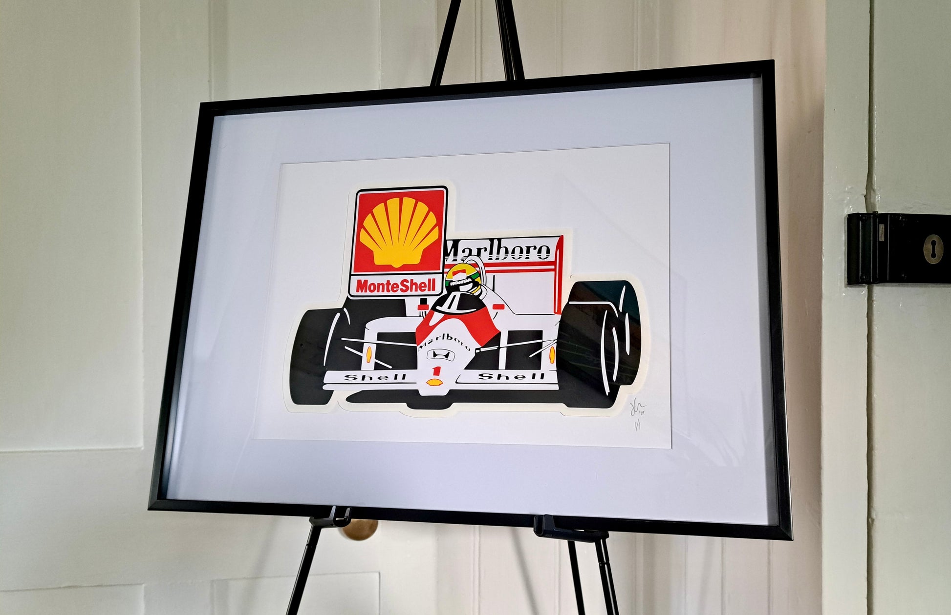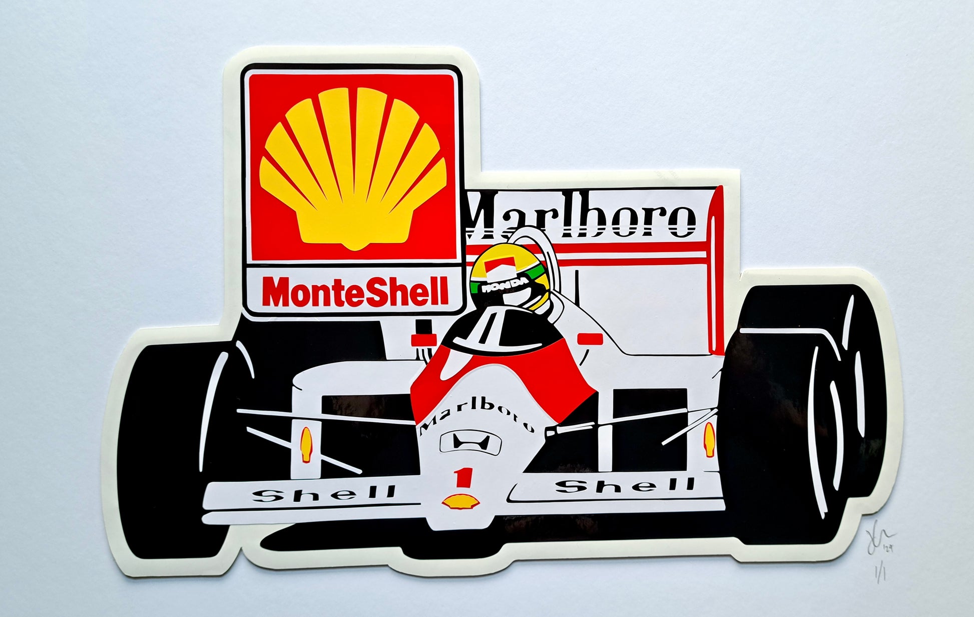 This rendition of the Monte Shell sticker is made from individually hand-cut coloured vinyl shapes and letters - without ever using a ruler - to make a fine art version of this once sought after sticker.